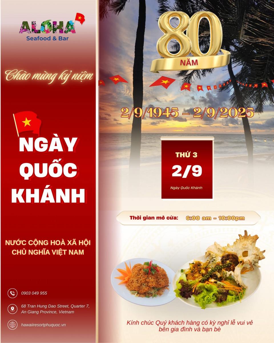 Trong không gian ấm cúng của Aloha, giữa khung cảnh biển đảo Phú Quốc thơ mộng, chúng ta không chỉ thưởng thức những món ăn đặc sắc mà còn cùng nhau ôn lại những trang sử vàng son của dân tộc. Kỷ niệm 80 năm Quốc khánh là dịp để mỗi gia đình, mỗi cá nhân suy ngẫm về truyền thống, văn hóa và những giá trị tốt đẹp mà các thế hệ cha ông đã dày công xây dựng.