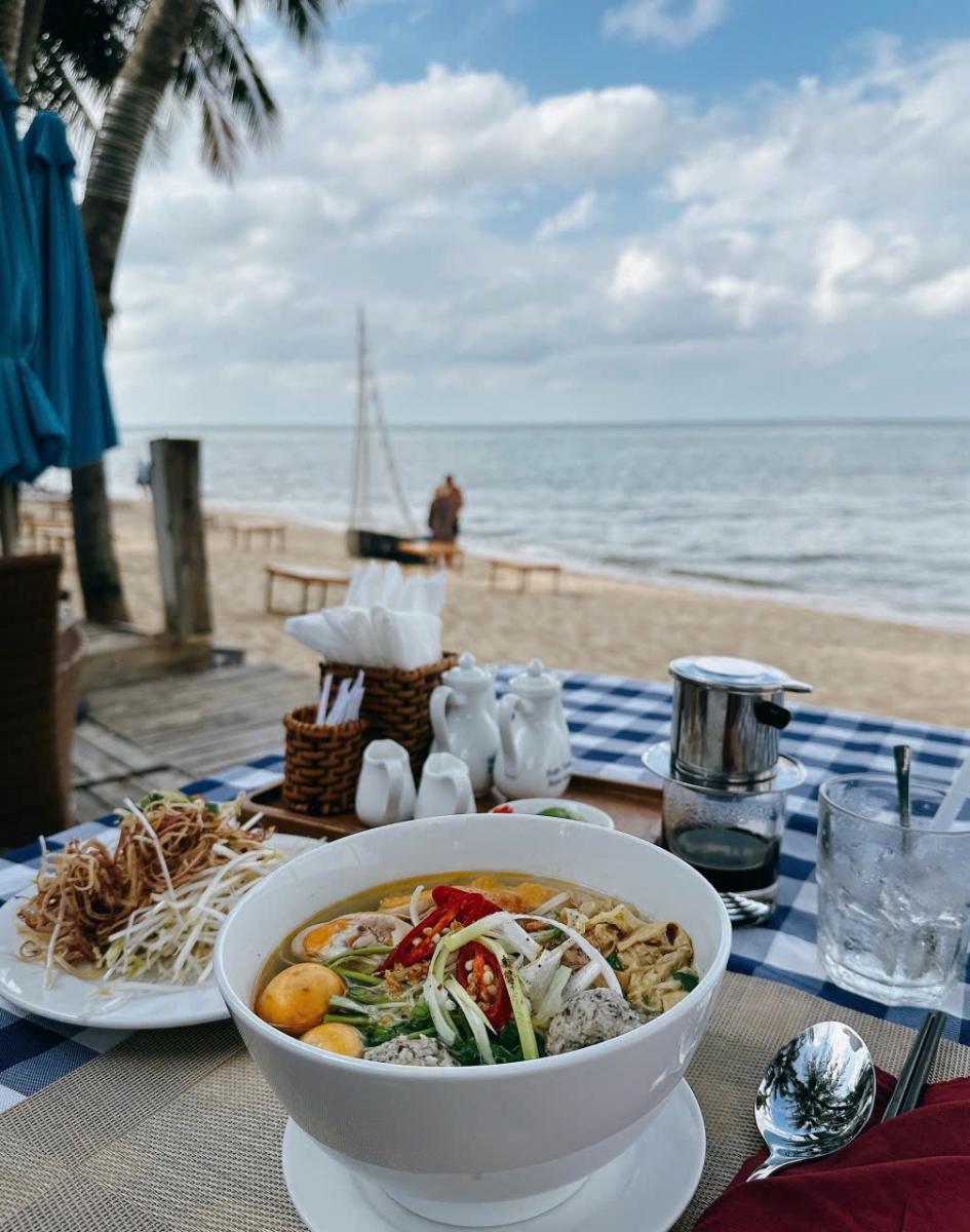 Bạn có thể chọn ngồi tại khu vực mái hiên hướng biển, nơi ánh nắng len qua những tán dừa, hoặc chọn một bàn đôi riêng tư cho buổi sáng nhẹ nhàng.